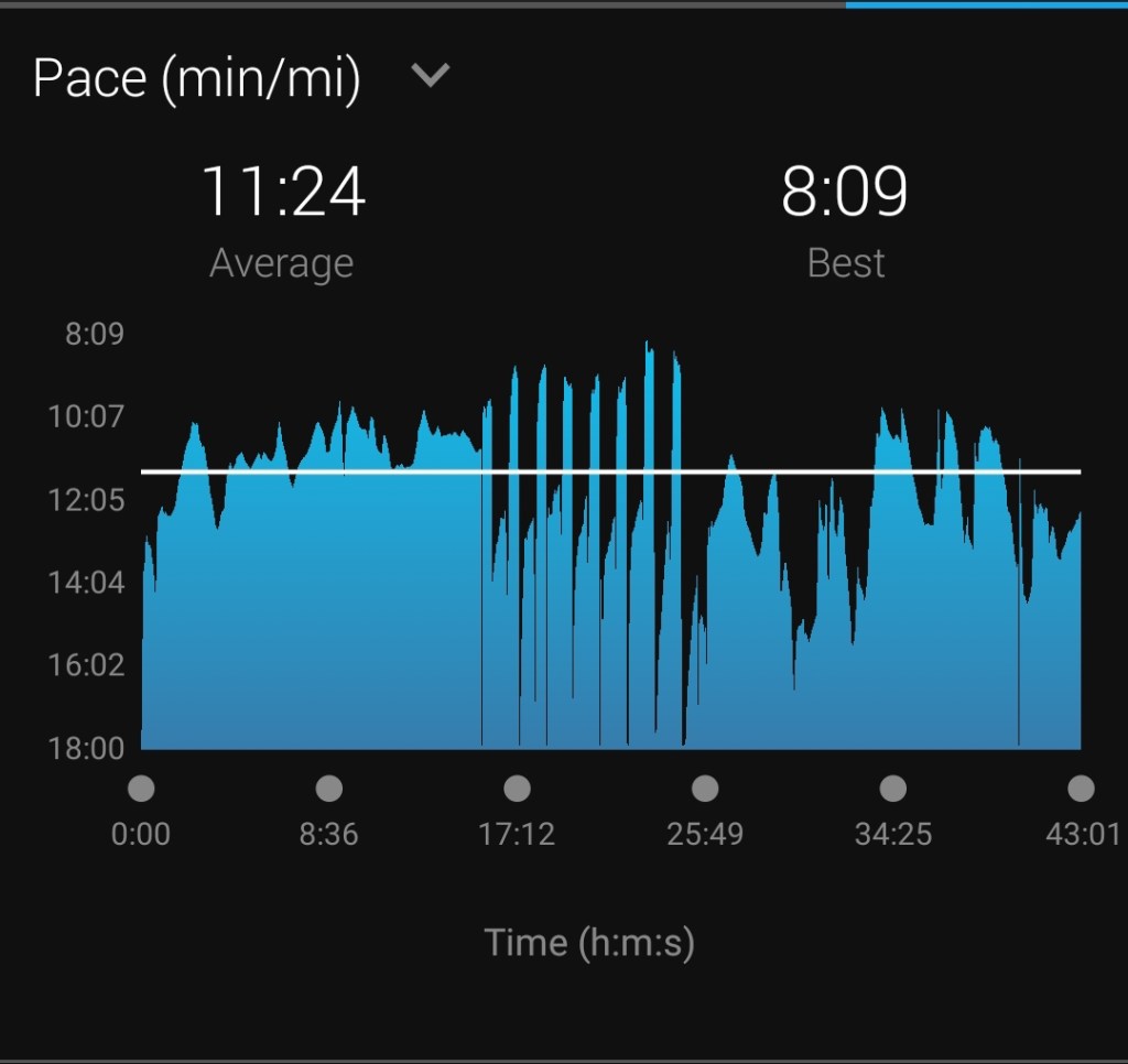 Today’s session was 15 minutes easy running to warm up, a run fast up the hill for 30 seconds and then jog down (about 45 seconds for me) eight times followed by 15 minutes easy running get home. I think this was a session that was in a Runner’s World marathon training plan. I ran the whole session across three and a half miles.