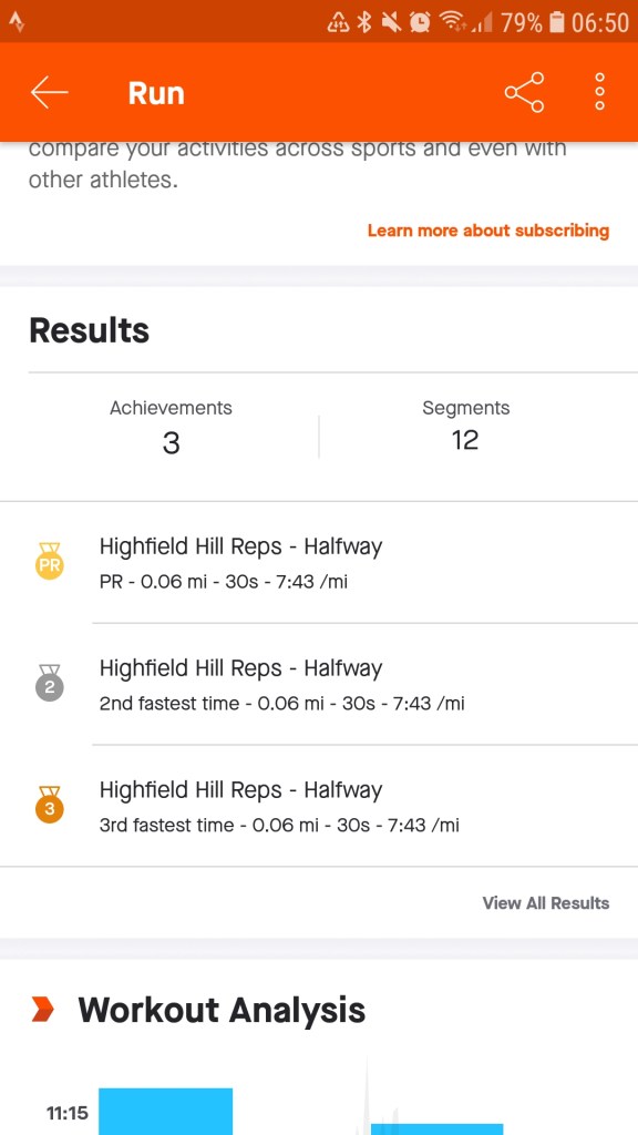 I’m impressed that I managed to pace myself fairly consistently so that I reached the same point up the hill each rep. Or at least I thought I had until I looked at my data, those peaks aren’t quite hitting the top spot at the same point but nevermind. It’s been ages since I have done a hills session so I’m still pleased over all.