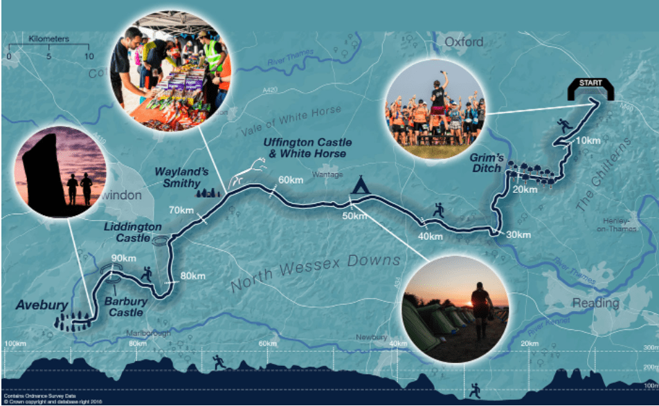 The Race to the Stones is 100k across the North Wessex Downs from Lewknor to Avebury, taking in the Uffington White Horse, Liddington Castle and Barbury castle. The race finishes, funnily enough, at the stones at Avebury.